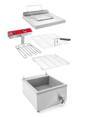Kompletně vyrobena z nerezové oceli, dodávána včetně dvou fritovacích mřížek (354x383 mm) s rukojetí, která se nezahřívá, ohřívače a víka, které lze využít jako odkapávací tác.