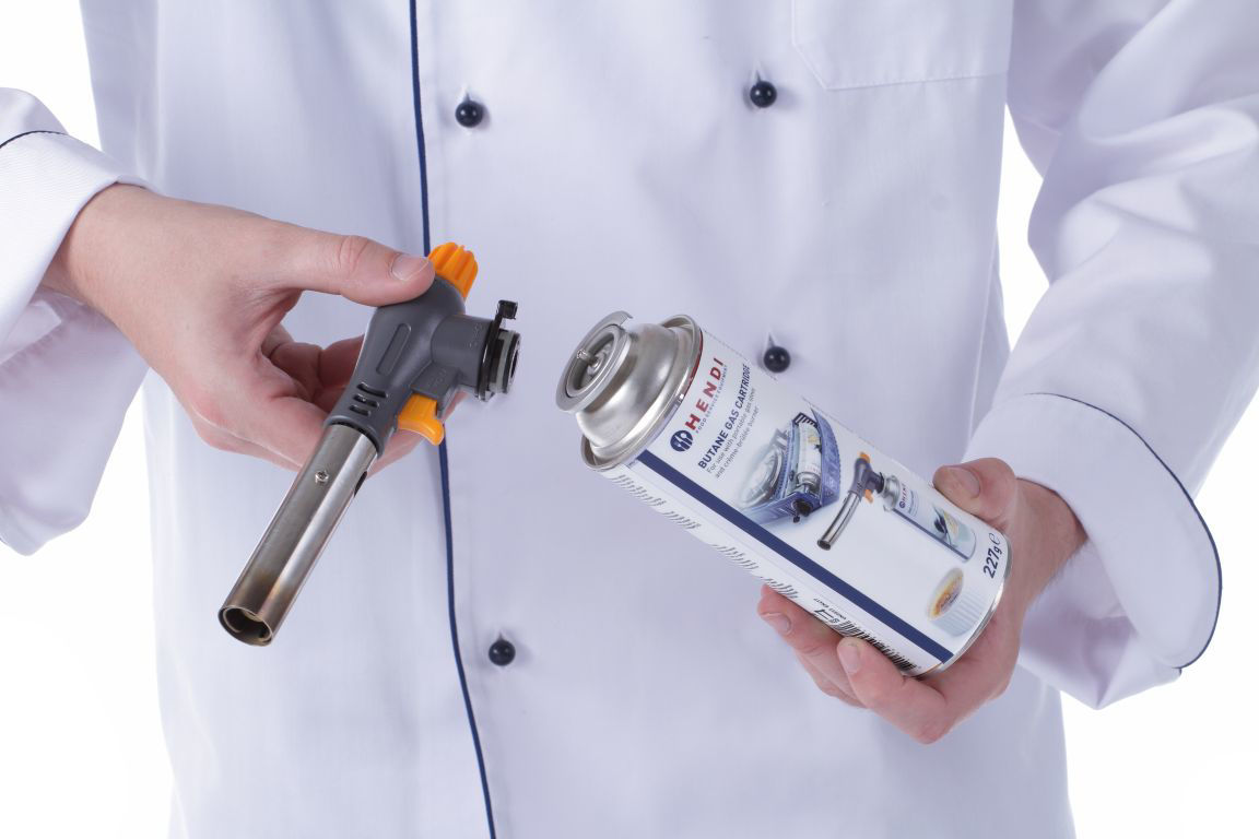 tento hořák na Creme-Brulée může být použit v libovolném úhlu, dokonce i dnem vzhůru, aniž by vzplanul hořák lze snadno a bezpečně připojit k plynové náplni, po vyprázdnění náplně jednoduše připojíte hořák na novou náplň plamen se snadno vznítí díky piezo zapalování a hoří světle modře