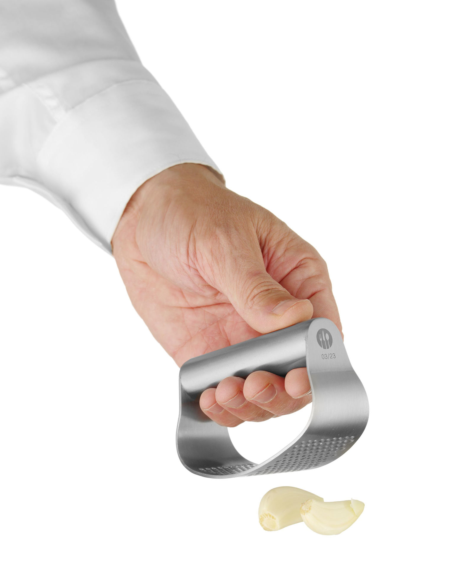 zahnutý oblouk umožňuje rychlé a snadné drcení i více stroužků česneku najednou
