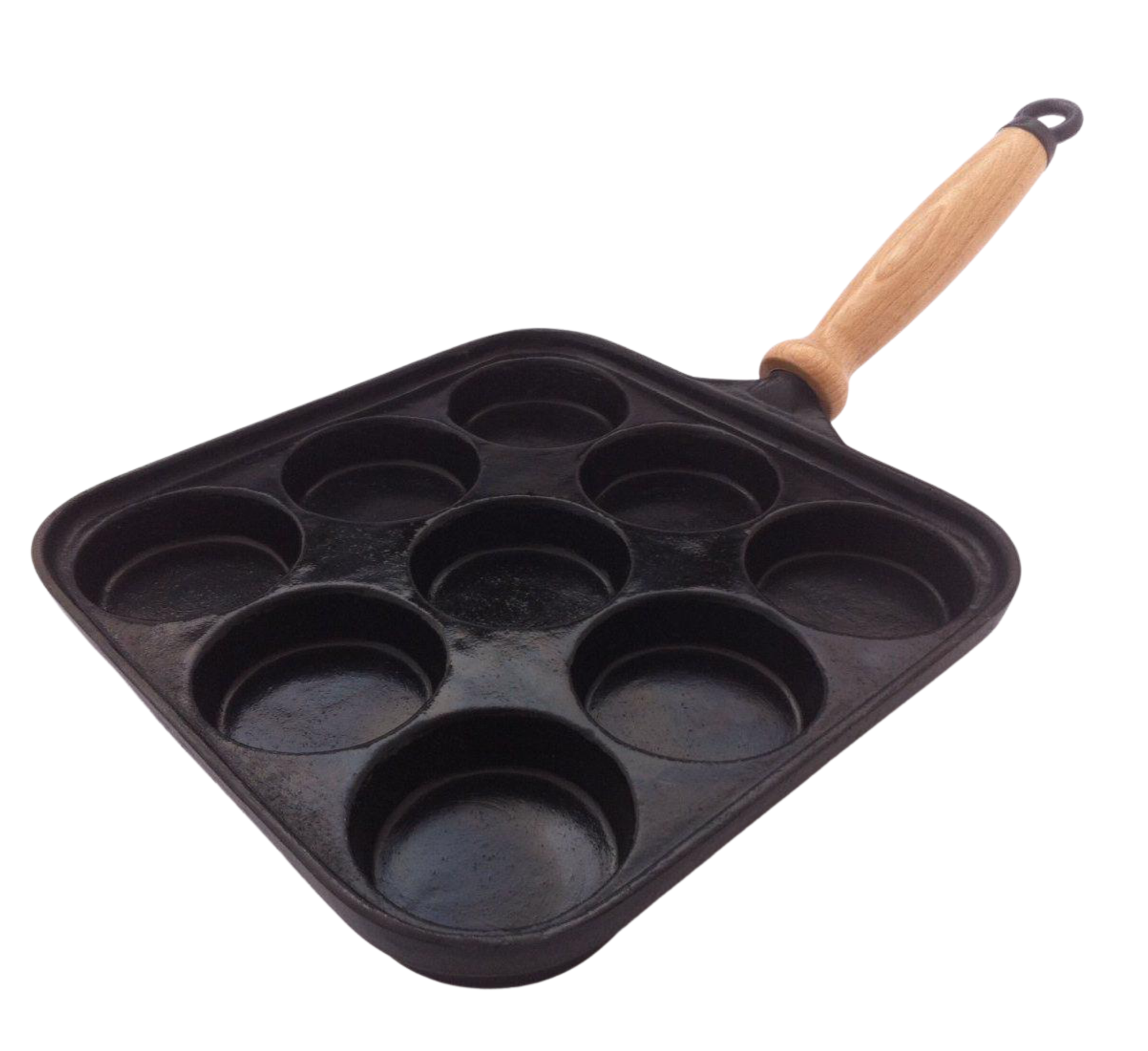 ruční výroba, odléváno do písku<br/>silikónový nepřilnavý povrch<br/>dřevěná rukojeť<br/>9 důlků - ? 7 cm<br/>vhodný pro přípravu lívanců, omelet, volských ok, bramboráčků,.....">