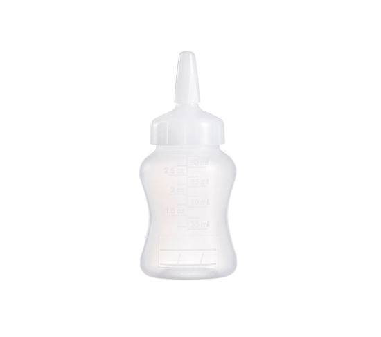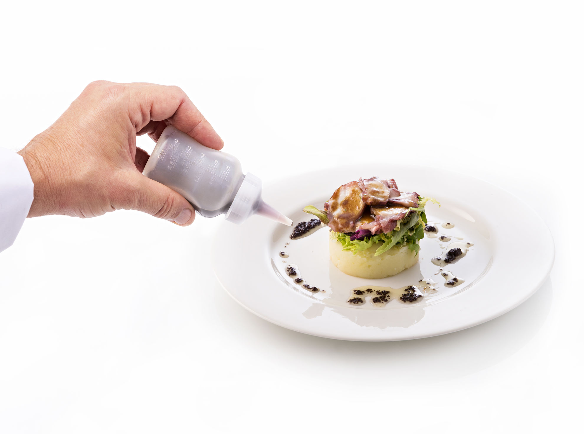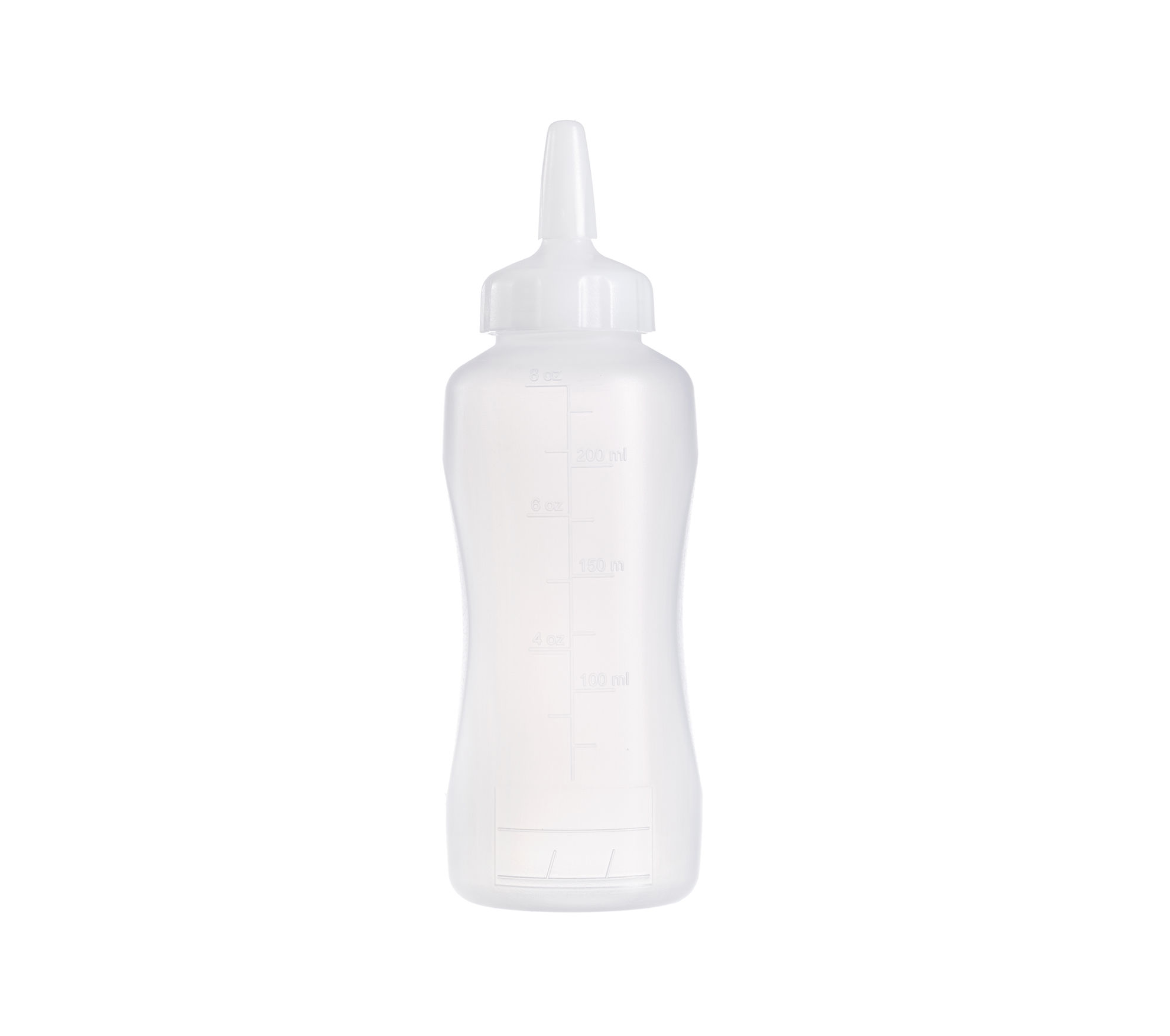 dispenzor, dávkovací láhev - plastová, na dresink, omáčku, olej, sirup, objem 90 ml, výška 11 cm, průměr 4,8 cm, se stupnicí, ergonomický tvar, průhledná, s vrškem
